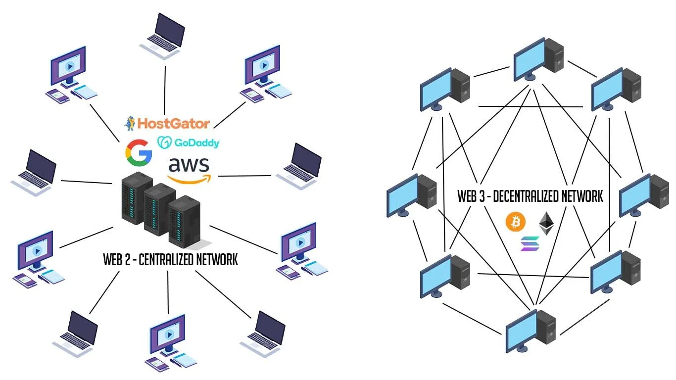 This model shows how web2 data is owned and regulated by “big tech,” while decentralized network’s redundency provides security, stability, and puts ownership in the hands of the users.